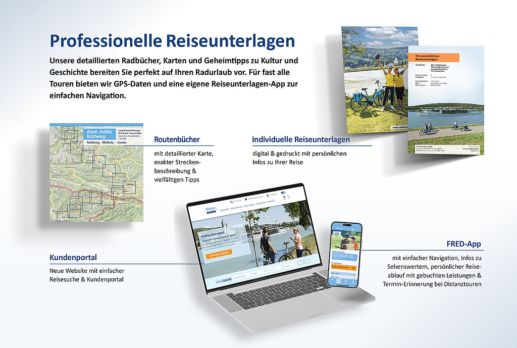 Für Ihre Radreise ist bereits alles bestens vorbereitet. Sie erhalten mit Ihren Unterlagen ein ausführliches Tourenbuch in gedruckter Form. Zusätzlich können Sie für € 10,– pro Buchung die digitale Variante – die Fred-App – hinzubuchen, die Sie unterwegs auf Ihrem Smartphone als praktischer Wegbegleiter unterstützt.