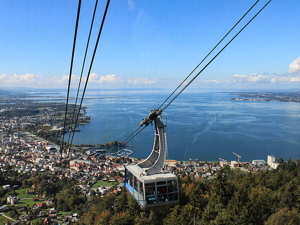 Die Pfänderbahn bietet Ihnen einen außergewöhnlichen Panoramablick über den Bodensee und auf 240 Alpengipfel. Direkt an der Bergstation befindet sich die Rheintalterrasse, von der aus Sie einen direkten Blick auf das Grenzgebiet des alten und neuen Rheins sowie auf die beeindruckenden Berggipfel der Schweiz, Liechtensteins und Vorarlbergs genießen können.