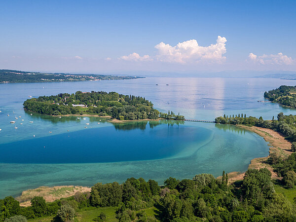 Diese Insel ist die größte der drei Bodenseeinseln. Seit 2000 ist sie mit dem Kloster Reichenau auf der UNESCO-Liste des Welterbes verzeichnet. Der idyllische Uferweg lädt zu einer Wanderung auf den Hochwart, den höchsten Punkt, ein um einen herrlichen Ausblick zu genießen. Mit Ihrem Rad können Sie zwischen Gemüsefeldern und Rebstöcken in die Pedale treten.