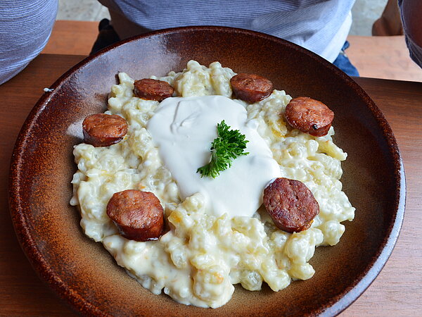 Die slowakische Küche besteht zum größten Teil aus Fleisch, Kartoffeln, Milch und Sauerkraut. Das typischste Nationalgericht der Slowakei ist Bryndzove halušky (Brimsennockerl). Das sind kleine aus Kartoffelteig zubereitete Klöße (halušky), die mit Schafsfrischkäse (bryndza) vermengt und anschließend mit gebratenem Speck bestreut und serviert werden. Mit diesem Gericht empfiehlt sich das Trinken von saurer Milch oder Buttermilch. Ein Gericht, das auf der Radreise von Wien nach Budapest nicht fehlen darf.