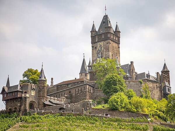 Die Reichsburg Cochem ist das markante Wahrzeichen der Stadt und thront eindrucksvoll über der Mosel. Schon von weitem sichtbar, prägt sie das Panorama der Region und zieht Besucher an. Die mittelalterliche Burg ist von zahlreichen Mythen und Legenden umgeben. Bei einem Besuch genießen Sie einen spektakulären Blick über die Moselschleife und die umliegenden Weinberge. Die historischen Räume können im Rahmen von Führungen besichtigt werden. Die Kombination aus Geschichte und Aussicht macht diesen Ort besonders einzigartig. Ein absolutes Highlight jeder Moselradreise.