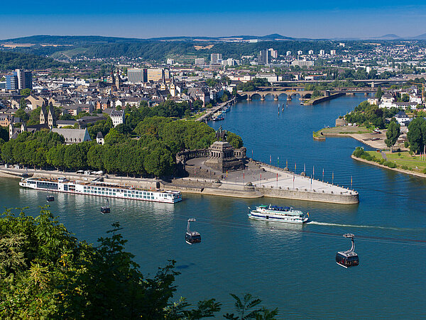 Das Deutsche Eck in Koblenz markiert den Zusammenfluss von Rhein und Mosel und ist ein bedeutender historischer Ort. Der Name geht auf den Deutschen Orden zurück, der sich hier im Jahr 1216 niederließ. Das imposante Kaiser-Wilhelm-Denkmal prägt das Erscheinungsbild dieses bekannten Platzes. Von hier aus genießen Besucher einen beeindruckenden Blick auf beide Flüsse. Die Promenade lädt zu entspannten Spaziergängen ein. Koblenz selbst begeistert mit einer lebendigen Altstadt und zahlreichen Sehenswürdigkeiten. Ein perfekter Abschluss einer Radreise entlang der Mosel.